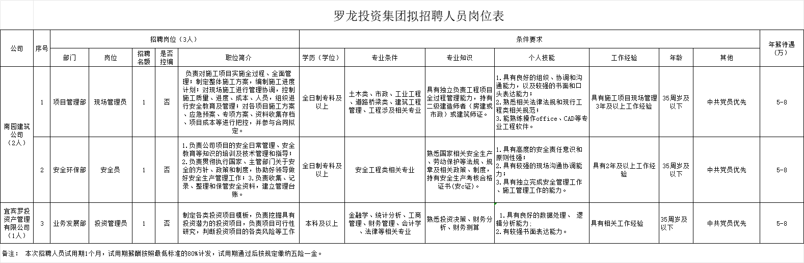 【概要描述】四川宜众劳务开发有限公司按照公开、平等、竞争、择优的原则,面向社会公开招聘3名工作人员,派遣至宜宾罗龙工业集中区投资集团有限责任公司工作。现将有关事宜公告如下。 一、招聘岗位及应聘人员基本条件 (一)招聘岗位及条件 (二)招聘基本资格条件 1 遵纪守法、品行端正、诚信廉洁,具备较高的思想政治素质和良好的职业道德修养。 2 具有强烈的事业心