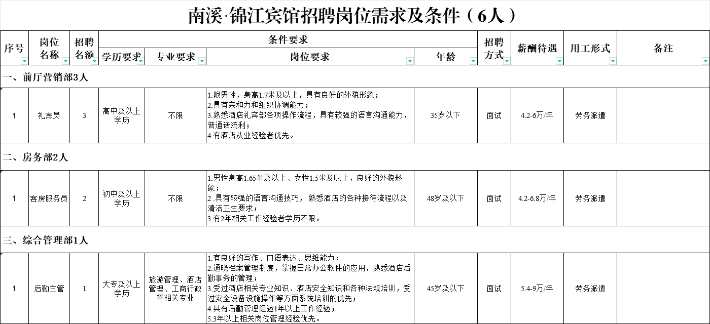 【概要描述】宜众劳务公司按照公开、平等、竞争、择优的原则,面向社会公开招聘服务人员,派遣至宜宾南溪仙源文化旅游发展有限公司工作。有关事宜公告如下: 一、招聘条件 (一)招聘岗位及招聘条件: (二)招聘基本条件: 1 拥有中华人民共和国国籍; 2 拥护中华人民共和国宪法,遵守国家法律法规,拥护党的理论和路线方针政策,具有良好的政治素养、职业操守和服务