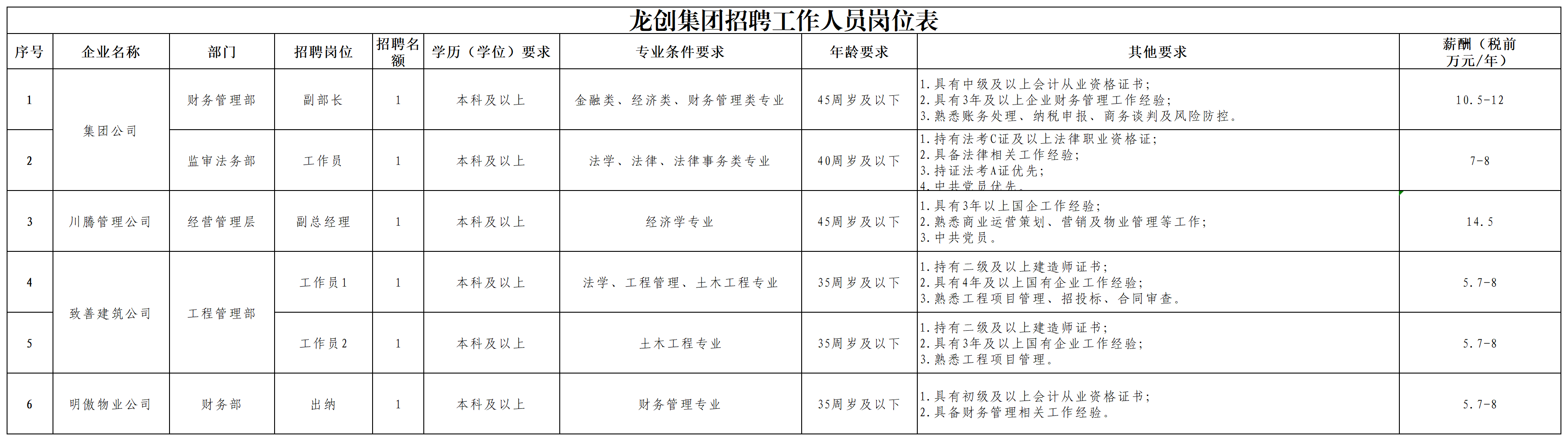 受宜宾市南溪区龙创产业运营集团有限责任公司委托,四川宜众劳务开发有限公司按照“公开、平等、竞争、择优”的原则,面向社会公开招聘6名国企工作人员,现将具体事项公告如下。