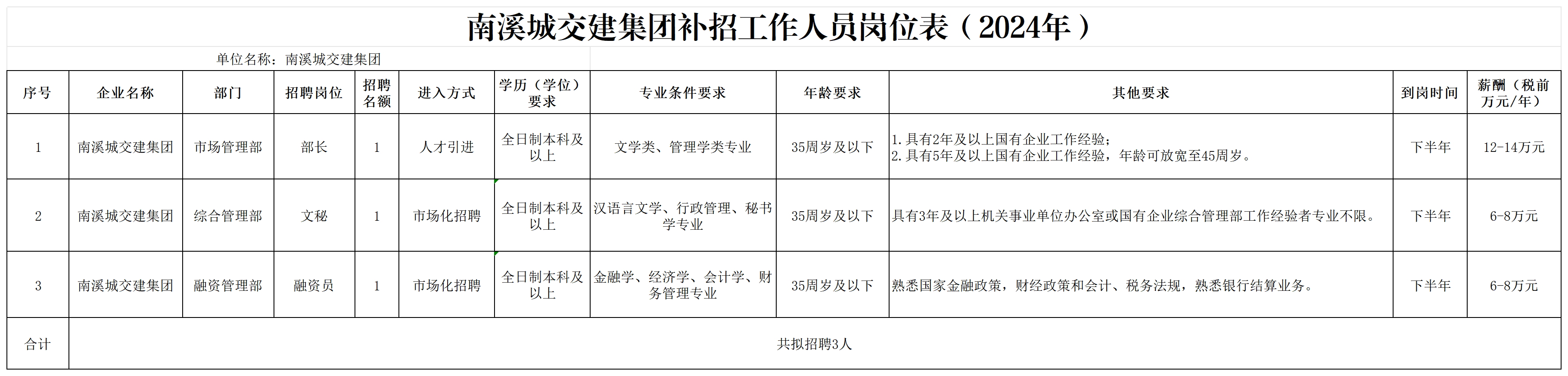 受宜宾南溪城市和交通建设集团有限责任公司委托,四川宜众劳务开发有限公司按照“公开、平等、竞争、择优”的原则,面向社会公开招聘3名国企工作人员,现将具体事项公告如下。