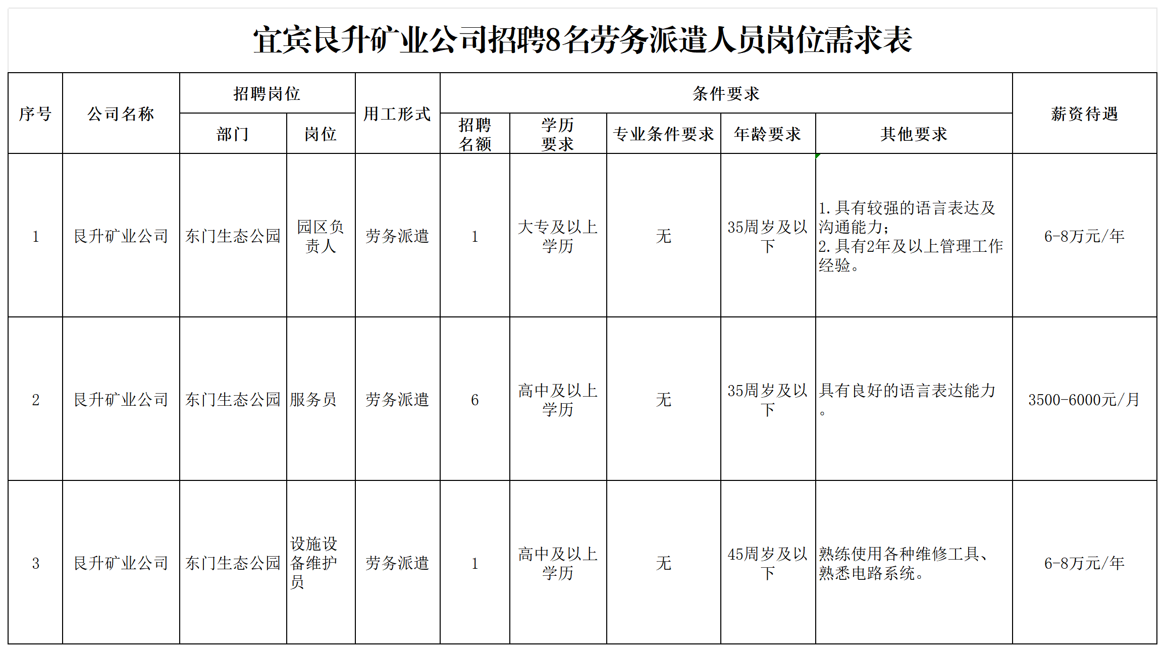 四川宜众劳务开发有限公司按照公开、平等、竞争、择优的原则,面向社会公开招聘8名工作人员,派遣至宜宾艮升矿业公司工作。现将有关事宜公告如下现将有关事宜公告如下: