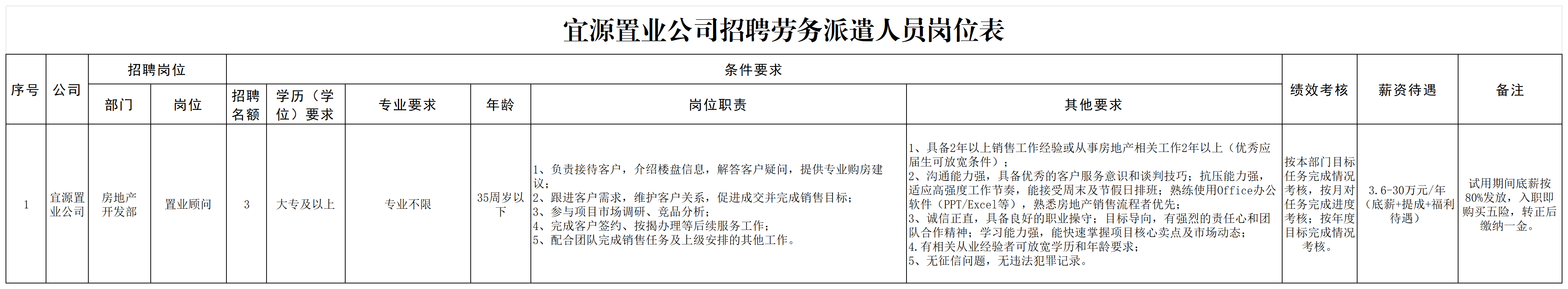 四川宜众劳务开发有限公司按照公开、平等、竞争、择优的原则,面向社会公开招聘3名置业顾问,派遣至宜宾宜源置业有限公司工作。现将有关事宜公告如下。