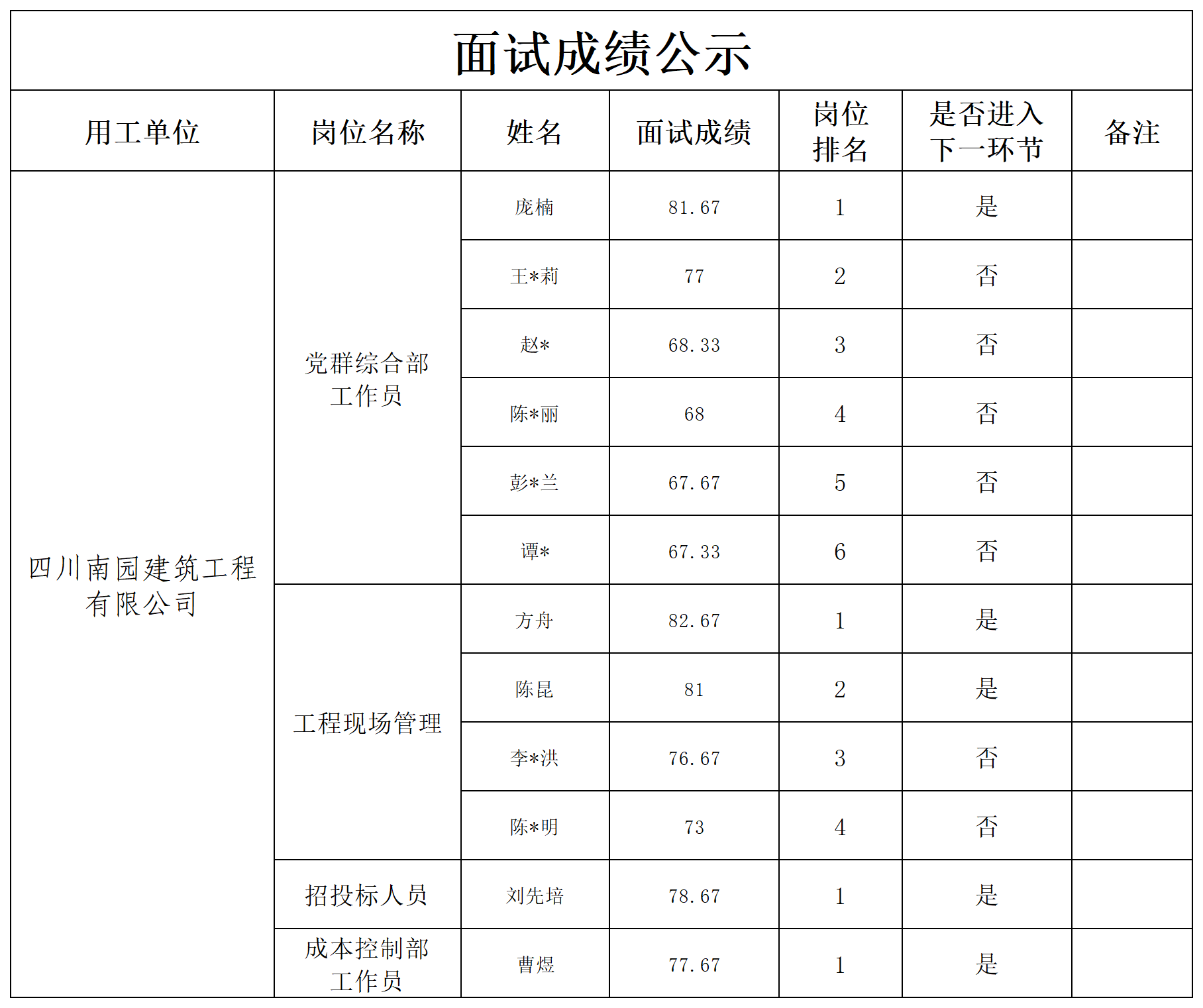 【概要描述】四川宜众劳务开发有限公司关于招聘工作人员的成绩公示 根据《四川宜众劳务开发有限公司公开招聘工作人员的公告》规定,现将成绩予以公示。 一、公示期 2023年7月24日-7月26日(不含双休日、节假日)。 二、面试成绩公示 三、公示要求 1 如对公示内容有异议,请以书面、署名形式反映。 2 反映人应以真实姓名实事求是的反映,并提供必要的调查线索。