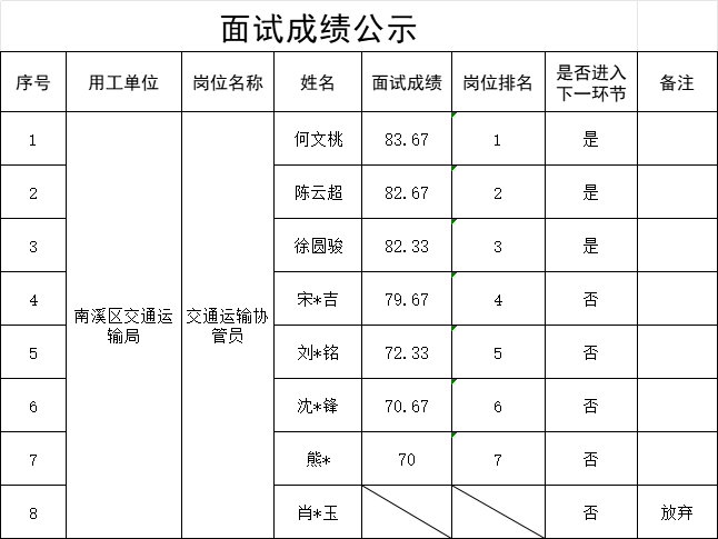 四川宜众劳务开发有限公司关于招聘3名交通运输协管员的面试成绩公示
