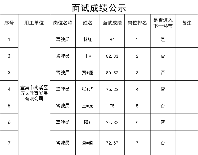 四川宜众劳务开发有限公司关于公开招聘驾驶员的面试成绩公示